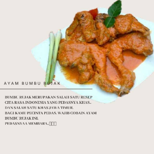 Salah satunya adalah ayam bumbu rujak khas jawa. Enak dimakan dengan lalapan segar. Bahkan menu menu makanan khas di masing masing daerah di nusantara pun banyak yang berbahan ayam lho. Ayam bakar bumbu rujak mempunyai cita rasa yang gurih dengan bumbunya yang sedikit pedas dan manis di jamin rasanya akan menggugah selera makan anda.