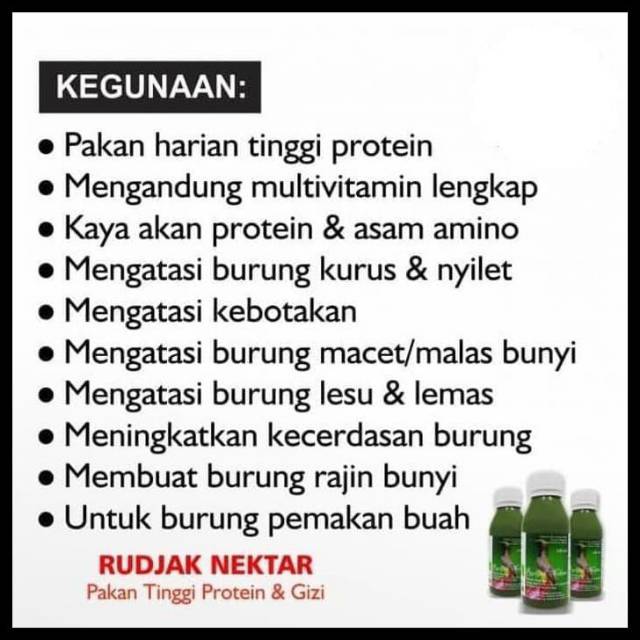 Burung tetap berisisehat dan rajin bunyi tentunya. Botol kecil 130 ml rp 27000 botol besar 250ml rp 40000 rudjak nektar pakan harian sehatalamiorganik pakan semua jenis k o l i b r i penghisap nektar. Rawat sehat terus jangan gonta ganti pakan sembarangansetting yang passampai tiba saatnya gacor ngobra dan fighter. Caruban bisa mengubungi nesta gembel ningrat.