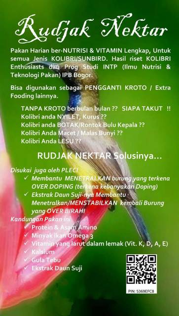 Rudjak nektar pakan kolibrikoninsunbird pakan harian bernutrisi lengkap protein tinggi kaya vitamin dan praktis tanpa kroto burung tetap sehat berisi dan pastinya rajin bunyi. Produk ini sangat tepat untuk kebutuhan vitamin pakan harian burung kolibri.