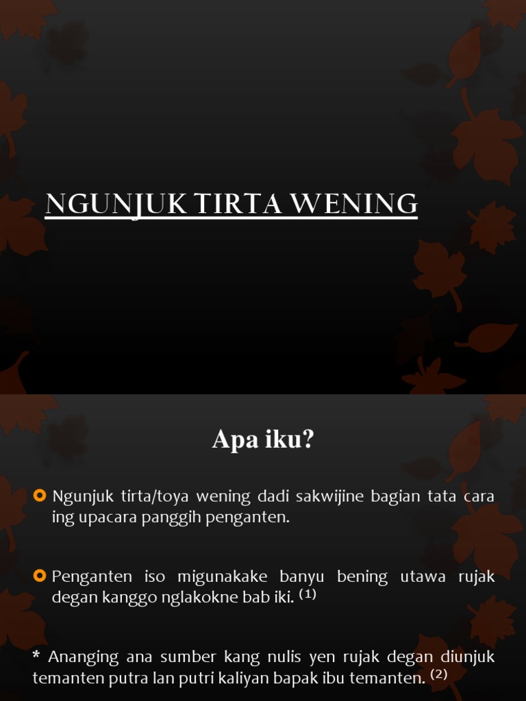 Jenis jenis wangsalan yaiku. Wirausaha adalah seorang yang berani berusaha secara mandiri dengan mengerahkan segala sumber daya dan upaya meliputi kepandaian mengenali produk baru menentukan cara produksi baru menyusun operasi untuk pengadaan produk baru memasarkannya serta mengatur permodalan operasinya untuk menghasilkan sesuatu yang bernilai lebih tinggi. Dene rujak degan kaistha kadidene pepenget kagem temanten supados ing sugengipun lelumban wonten ing pasrawungan puniko mboten ngepang ngepang lan. Langkah langkah upacara dari timbangan hingga ngunjuk tirta wening ini disebut upacara adat krobongan karena dilakukan di dalam krobong.