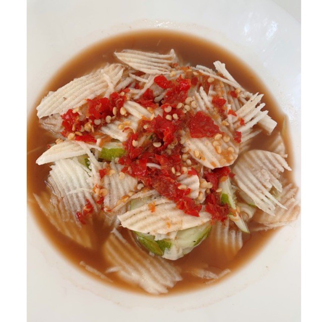 Kuah pindang yang sudah tercampur menjadi satu dengan rujak menjadi ciri khas dari rujak ini.